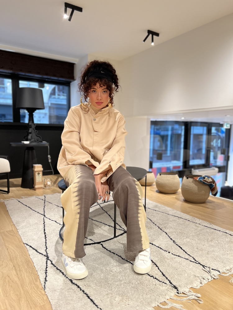 Ce pantalon fluide tie and dye aux tons de beige et taupe s’associe harmonieusement avec une veste beige, créant ainsi un look parfaitement adapté à l’arrivée des beaux jours.